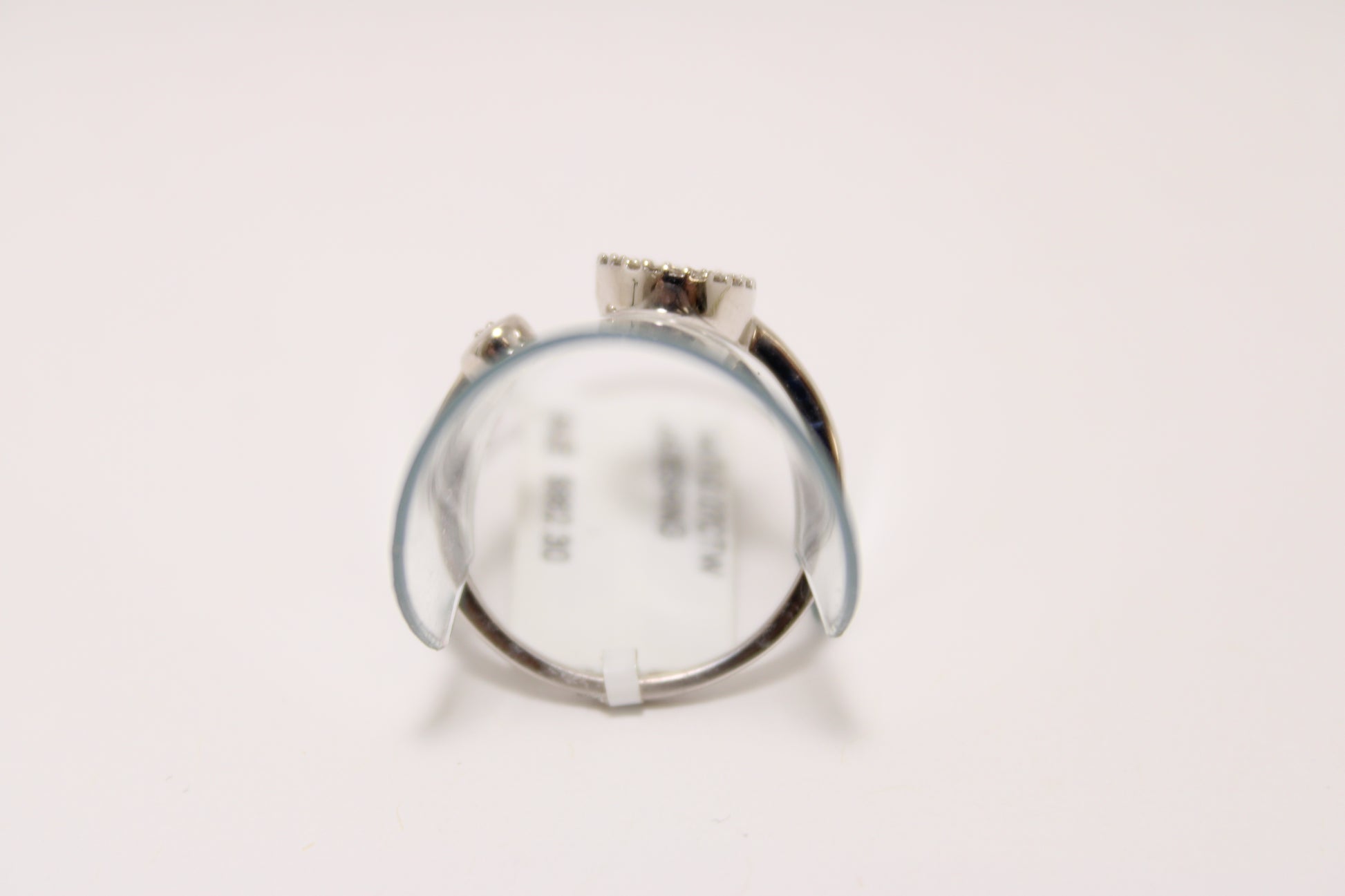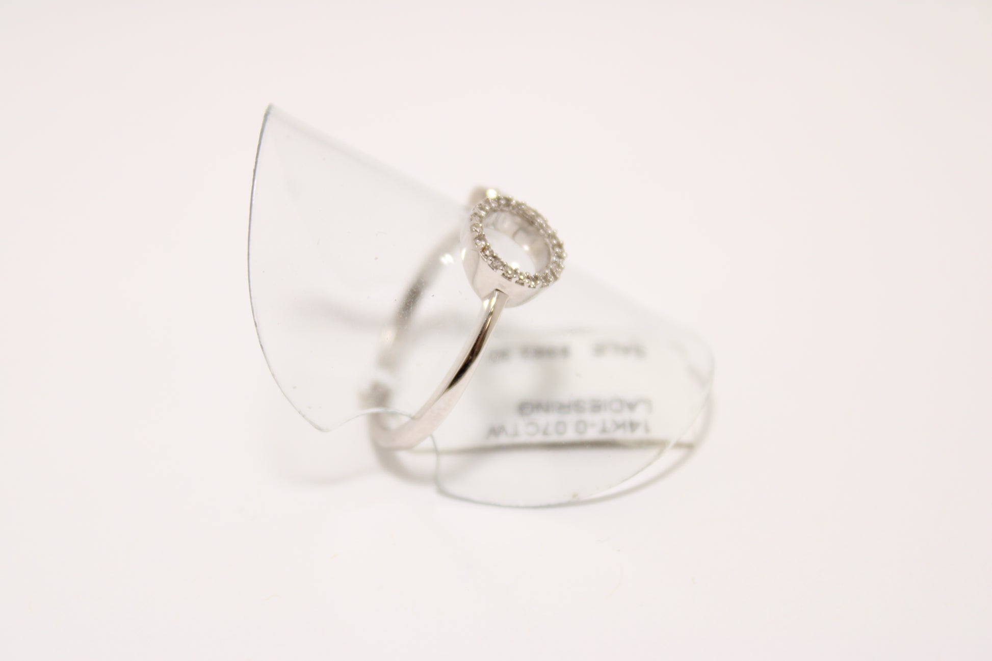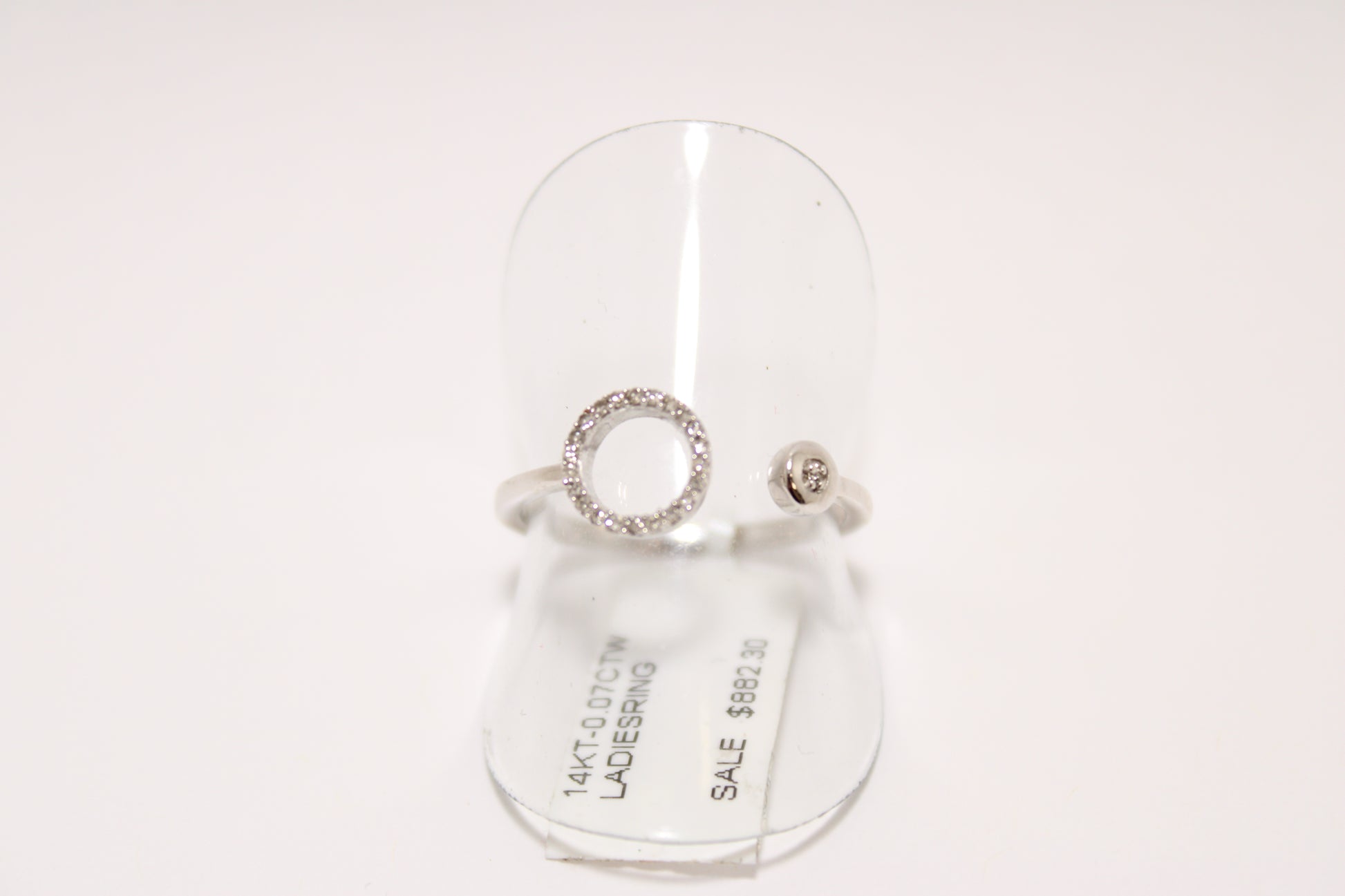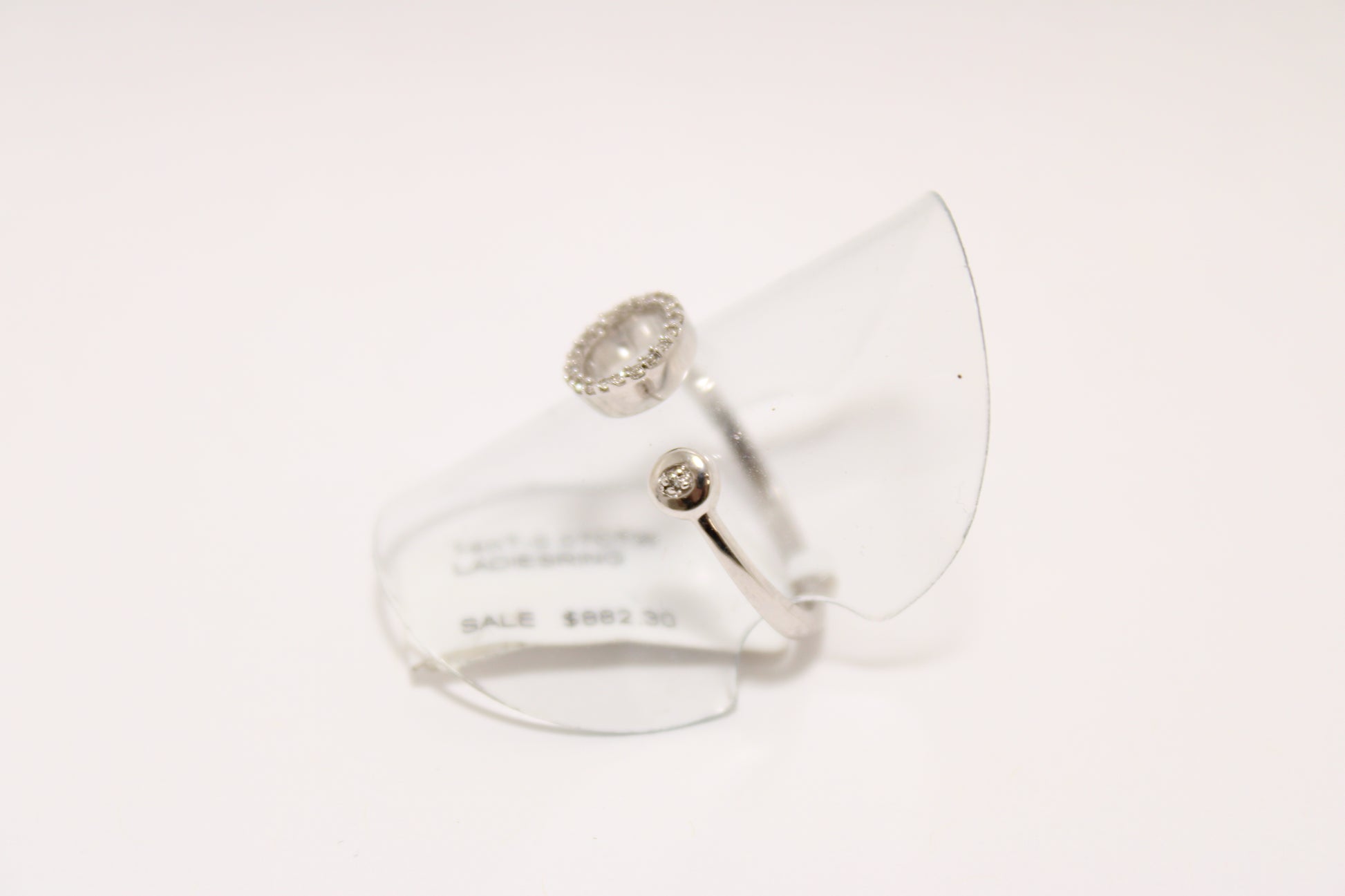 This elegant 14K white gold open ring features a modern and refined design. One end showcases a delicate open circle adorned with shimmering pavé-set stones, while the opposite side is finished with a single bezel-set stone, creating a beautifully balanced and contemporary look.