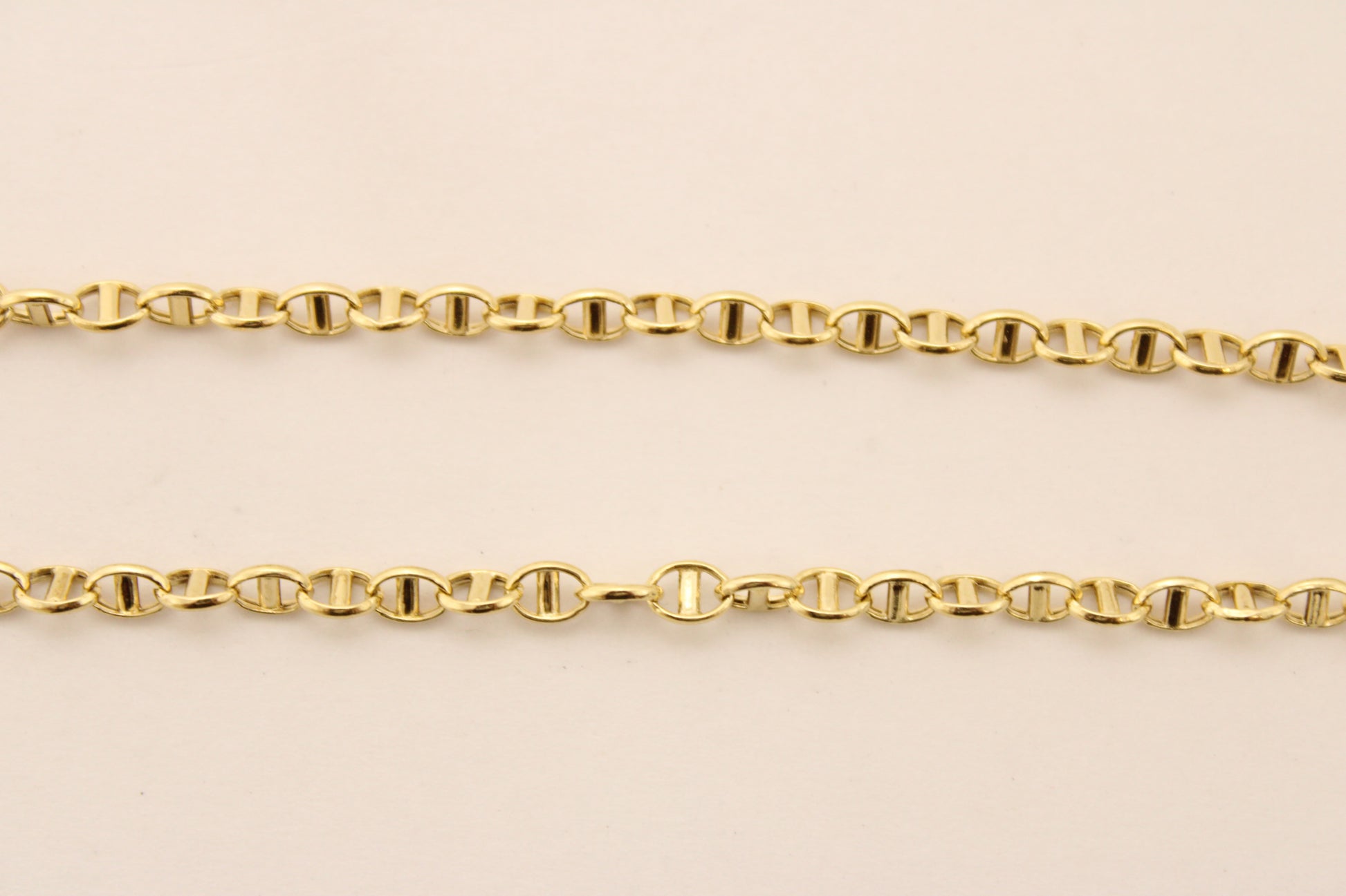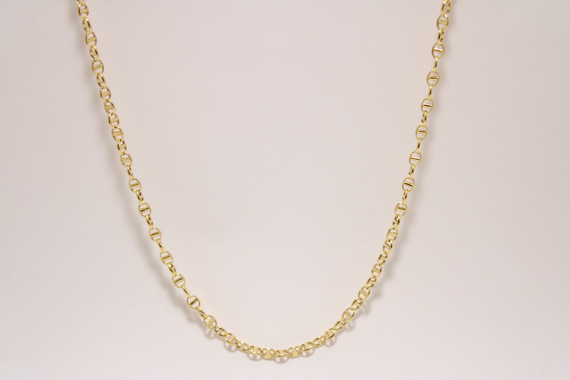 Elegant 18K gold chain featuring a round mariner link design. The 20-inch length provides a classic, comfortable fit, perfect for everyday wear or special occasions. A durable, timeless, and sophisticated piece.