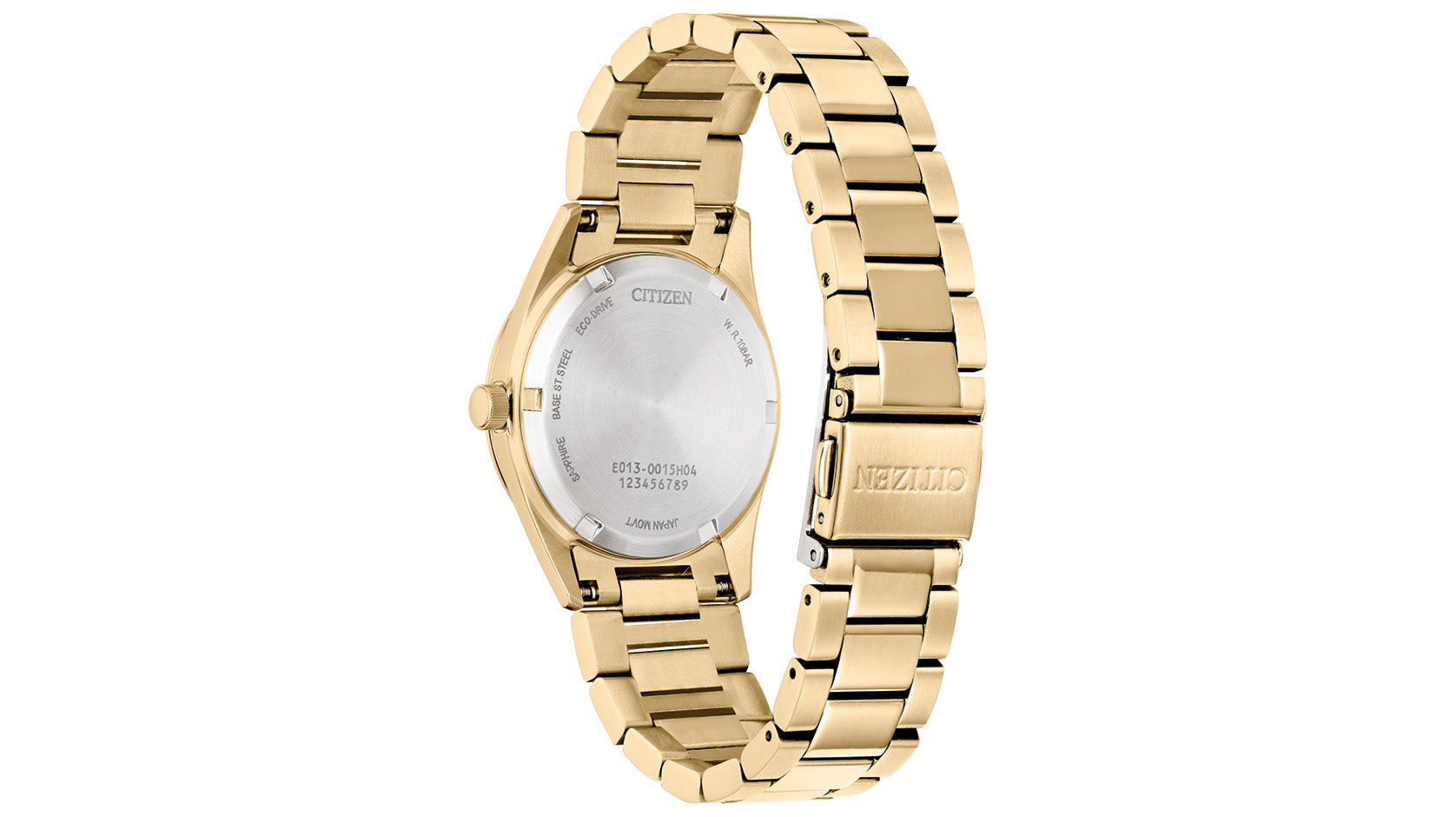 When sporty style meets luxury, you get this latest stunner from Citizen. Joining ready-for-anything wearability with feminine elegance, this time-and-date timepiece is the ultimate day-to-evening watch to wear. The gold-tone stainless steel case measures 33mm in diameter and is presented on a matching, 3-link stainless steel bracelet for a sleek, versatile wear on the wrist. The radiant white mother-of-pearl dial is characterized by its highly legible style and diamond accents, elevating the sporty wearer one step further. A water resistance up to 100 meters helps the dynamic watch maintain a host of functionality without compromising its alluring appearance. Powered by Citizen’s proprietary Eco-Drive technology to provide light-powered vitality continuously and sustainably without ever needing a battery. Caliber E013.
